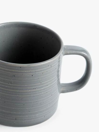 • A set of four modern mugs made from stoneware. The mugs are coated with a reactive speckled glaze and are dishwasher and microwave safe for everyday use.